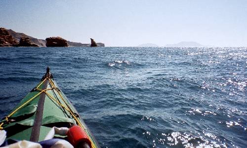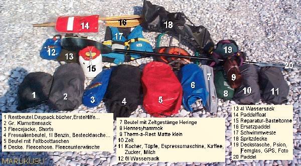 Ausrüstung![]() Nautiraid Greenlander MK III Baujahr 2000, Bootswagen, Seesocke (selbst geschneidert), North Face Bullfrog Zelt, Therma Rest Matte, Ersatzpaddel, Schwimmweste, Handpumpe, Paddelfloat, Handy, GPS (Garmin 12), Psion5 MX Pro in einer Otterbox, Sony Weltempfäner ICF SW100, Silva 70 Deckskompaß, Wander Kompaß, Wanderkarte Westkreta 1: 100.000 (HarmsIC Verlag), Treibanker, Segelschirm, Colman Benzinkocher, 10l Wasser, Kodak DC210 Digitalkamera, Konika MerMaid wasserdichte Kamera, Extrata 8x27N wasserdichtes Fernglas, diverse wasserdichte Beutel, und Boxen. Kleiding, kein Neo oder Trockenanzug (Wassertemperaturen um 24°)... Insgesammt 60kg. |