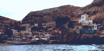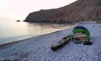 16.10.2000 Sougia bis A.Roumeli GPS LogWetter: windstill, heiß, sonnig Um 09:40 ist das Zelt abgebaut und das Kajak ins Wasser geschoben. Es geht an langen Stränden der unbewohnten Felsküste entlang bis Agia Roumeli, der Durchgangsstation der Samariaschlucht-Touristen. Ich habe das Faltboot am Strand geparkt, bin zur nächsten Taverna und habe erst mal das Ankomm-Bier bestellt und dazu was gegessen. Einige Zeit vertreibe ich mir, mit dem Beobachten der Touries, die nach den Tavernenbesuchen gut abgefüllt, noch ein mal an den Strand schwimmen wollen. Das letzte Schiff befreit Agia Roumeli von der Hektik. Als die Sonne langsam hinter den Bergen verschwand, tref ich die Vorbereitung für die Nacht: alle Säcke die ich zum Zelten brauche aus dem Innern des Faltbootes gezurrt und gewartet bis es fast dunkel war, um dann das Zelt aufzubauen. Am Abend speißte ich in der Taverne. |
