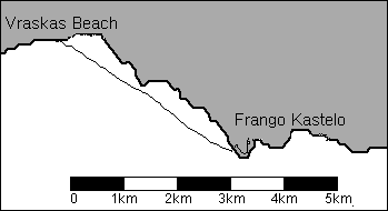 19.10.2000 Vraskas Beach bis Frango Kastello GPS LogBei nördlichem Wind gestartet, habe keine zwei Paddelschläge gemacht und der Wind treibt mich schon in die richtige Richtung. Habe meinen spezial Segelschirm aufgeklappt und los geht es. Mit bis zu 10 km/h und X Knoten (GPS lügt nicht) rausche ich dem Ziel Frango Kastello entgegen. Viel stärker hätte der Wind nicht sein dürfen, bei den Wellen die sich aufgebaut haben. Es ist eine wahre Freude die Bugwelle spritzen zu sehen. Nach weniger als einer Stunde ist mein Tagesziel erreicht. Ein seichter Sandstrand ohne Wellen erleichtert mein Anland ziehen des Bootes. In der Taverne keine 20m entfernt, frühstücke ich erst mal ausgiebig. Nach einem kleinen Rundgang zum östlich gelegenen Strand entscheide ich mich für ein Zimmer der Taverne "Kali Kardia” (N035°10'55''62 E024°13'56''61) in der ich vor 10 Jahren schon mal war. Es ist eine gute Entscheidung, denn der Wind frischt noch mehr auf und es bewölkt sich zunehmend. Ich karre das Faltboot also ein paar Meter direkt vor mein idyllisches Zimmer, und freue mich über diese gute Entscheidung, denn es fängt an zu regnen. ![]() |