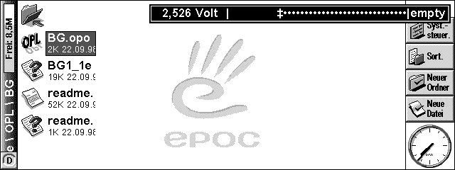 BatGauge 1.4 (Lite)This program displays the estimated battery run time, and the battery voltagestatus in the right upper corner of the display for a few seconds. Sincethe battery run time is very strongly dependent on the battery type, itcan be adjusted, NiHH Akkus runs on my Psion for approx. 10 hours, Alkalineapprox. 20. The upper and lower-volt-delimitation and the Battery-empty-warninglimit (LowVoltageAlarm) can be adjusted. Battery Gauge does not drain yourbattery, because it runs only once when invoket.The Settings can be changetwhen batteries are changet, first time invoket, or when you call BGini.opo Installation: Best to use with the marvelous Macro5, so every time thePsion is switched on it shortly appears. Batgauge can also be startedfrom the System screen by just tipping on it. | Batgauge 1.4 |